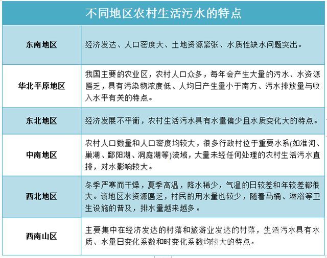 眾所周知,我國不同地區(qū)的農(nóng)村具有不同的特征,所產(chǎn)生的農(nóng)村生活污水在成分上存在差異。比如,經(jīng)濟條件較好、消費水平高的地區(qū),生活污水中的氨氮濃度較高;而經(jīng)濟條件較差的地區(qū),往往生活污水反復(fù)使用后才排放,所以化學(xué)氧量濃度較高。歸根結(jié)底,造成這一區(qū)別的無非是受到氣候、地形、人口數(shù)量和經(jīng)濟條件等的影響,正如下表所示,每個地區(qū)都有其突出的特點,當(dāng)然在治理農(nóng)村生活污水時,也會被當(dāng)做重要的參考資料。